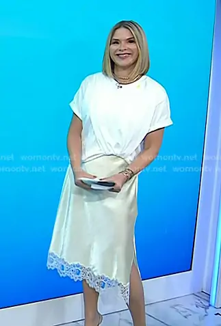Jenna Bush Hager on Today on NBC was spotted wearing this white tee and yellow satin skirt on Today on Mar 31 2026's episode. Jenna's Dress is the Mixed Media Short Sleeve Dress in White-Yuzu by 3.1 Phillip Lim.