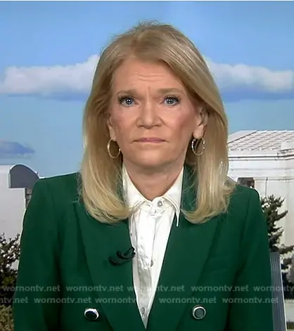 Martha Raddatz on Good Morning America on ABC was spotted wearing this green double breasted blazer on Good Morning America on Mar 31 2026's episode. Martha's Jacket is the Miller Double Breasted Blazer by Veronica Beard.