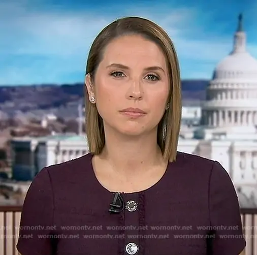 Elizabeth Schulze on Good Morning America on ABC was spotted wearing this purple short sleeve tweed dress on Good Morning America on Apr 01 2026's episode. Elizabeth's Dress is the Boucle Short Sleeve Button Front A-line Dress in Aubergine by Tommy Hilfiger.