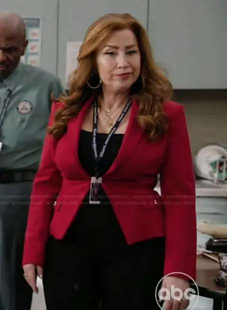 Melissa Schemmenti (played by Lisa Ann Walter) on Abbott Elementary on ABC was spotted wearing this red blazer on Abbott Elementary on episode 'April Fools' (5x18) in Apr 2026. Melissa's Blazer is the Vidia Ponte Blazer by Generation Love.