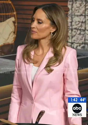 Rhiannon Ally on Good Morning America on ABC was spotted wearing this pink leather blazer on Good Morning America on Apr 02 2026's episode. Rhiannon's Jacket is the Breann Faux Leather Blazer in Petal by Alice + Olivia.