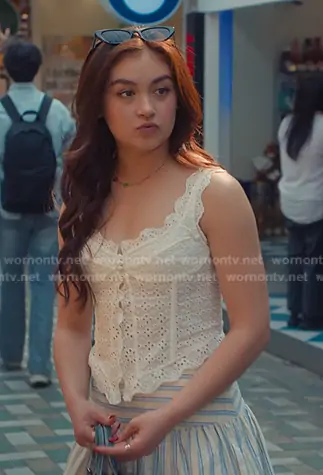 Katherine Song-Covey (played by Anna Cathcart) on XO Kitty on netflix was spotted wearing this white eyelet top and striped mini skirt on XO Kitty on episode 'Guest List' (3x01) in Apr 2026. Kitty's Top is the Dolce Verano Corset in White Eyelet by Out From Under . Kitty's Skort is the Striped Skort by Sandro . Kitty's Shoes is the Tokyo Shoes in Off White / Collegiate Green by Adidas . Kitty's Bag is the Mini Denim Duffle Crossbody Bag in Denim by BDG.
