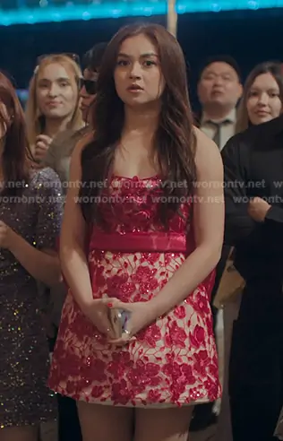 Katherine Song-Covey (played by Anna Cathcart) on XO Kitty on netflix was spotted wearing this pink floral strapless lace dress on XO Kitty on episode 'Guest List' (3x01) in Apr 2026. Kitty's Dress is the Alira Lace Dress in Cerise by Retrofete .