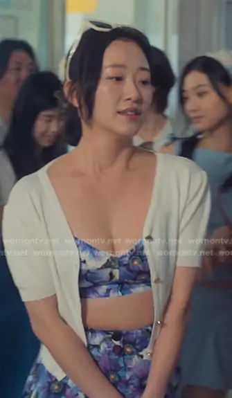 Yuri Han (played by Gia Kim) on XO Kitty on netflix was spotted wearing this purple floral crop top and shorts on XO Kitty on episode 'Guest List' (3x01) in Apr 2026. Yuri's Top is the Cropped Anemone-Print Charmeuse Corset by Dolce & Gabbana . Yuri's Shorts is the Anemone-Print High Waist Hot Pants by Dolce & Gabbana . Yuri's Bag is the Heart Shaped Handbag by A New Day.
