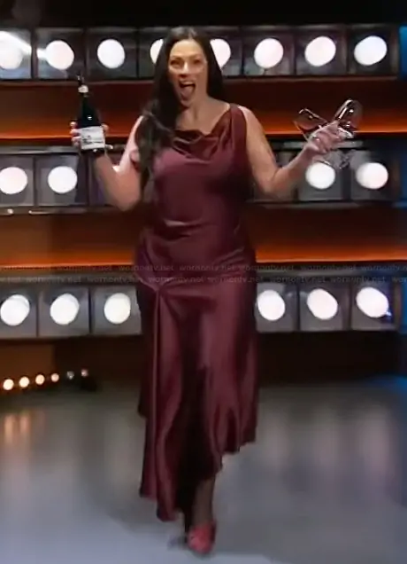 on The Kelly Clarkson Show on NBC was spotted wearing this burgundy ruched dress on The Kelly Clarkson Show on Apr 02 2026's episode. 's Dress is the Asymmetric draped gathered satin-crepe dress by Victoria Beckham.