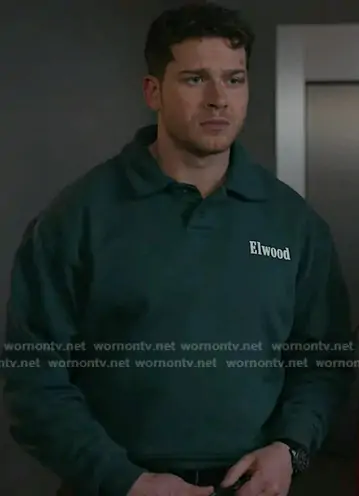Evan Buckley (played by Oliver Stark) on 9-1-1 on ABC was spotted wearing this green collared sweatshirt on 9-1-1 on episode 'Where There's Smoke' (9x16) in Apr 2026. Buck's Sweater is the Heavyweight Fleece Polo Collar Sweatshirt in Emerald by Elwood.