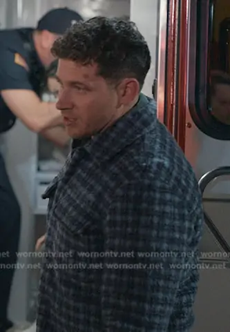 Evan Buckley (played by Oliver Stark) on 9-1-1 on ABC was spotted wearing this blue plaid fleece jacket on 9-1-1 on episode 'Where There's Smoke' (9x16) in Apr 2026. Buck's Jacket is the Caleb Brushed Plaid Shirt Jacket by Simkhai.