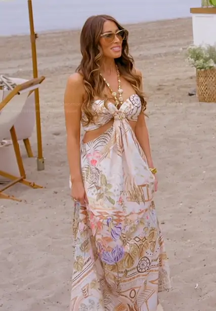 Liz McGraw on The Real Housewives of Rhode Island on Bravo was spotted wearing this floral print halter dress on The Real Housewives of Rhode Island on episode 'Welcome to Rhode Island' (1x01) in Apr 2026. Liz's Dress is the Kalani Satin Maxi Dress by Fashion Nova.