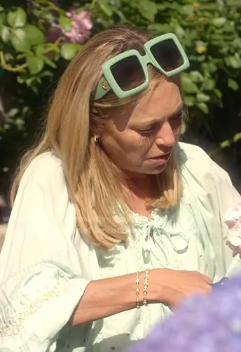 Sutton Stracke on The Real Housewives of Beverly Hills on Bravo was spotted wearing this mint green embroidered blouse on The Real Housewives of Beverly Hills on episode 'The Last Supper' (15x16) in Apr 2026. Sutton's Top is the Odina Top in Sea Foam by LoveShackFancy . Sutton's Sunglasses is the GG0783S Sunglasses in Green by Gucci.