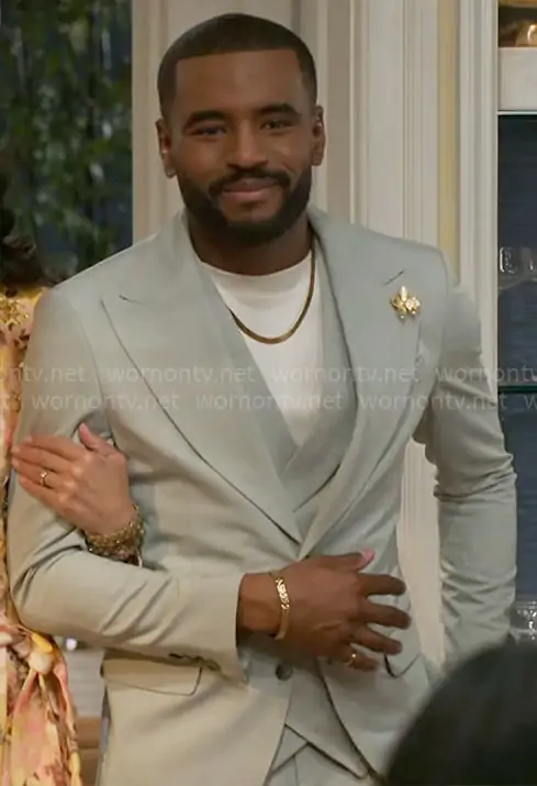 Andre Richardson (played by Sean Freeman) on Beyond the Gates on CBS was spotted wearing this sage green Easter suit on Beyond the Gates on Apr 03 2026's episode. Andre's Suit is the Powder Sage 3PSuit by Rich Men Looks.