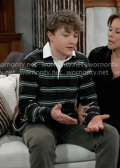 Danny Morgan (played by Asher Jared Antonyzyn) on General Hospital on ABC was spotted wearing this green striped shirt on General Hospital on Apr 03 2026's episode. 's Shirt is the Striped Long Sleeve Rugby Tee in Black by Urban Outfitters .