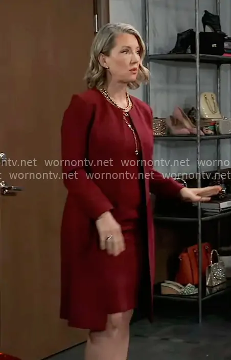 Nina Reeves (played by Cynthia Watros) on General Hospital on ABC was spotted wearing this red jacket and dress set on General Hospital on Apr 03 2026's episode. Nina's Set is the Jacket and Dress Suit in Bordeaux by Le Suit .