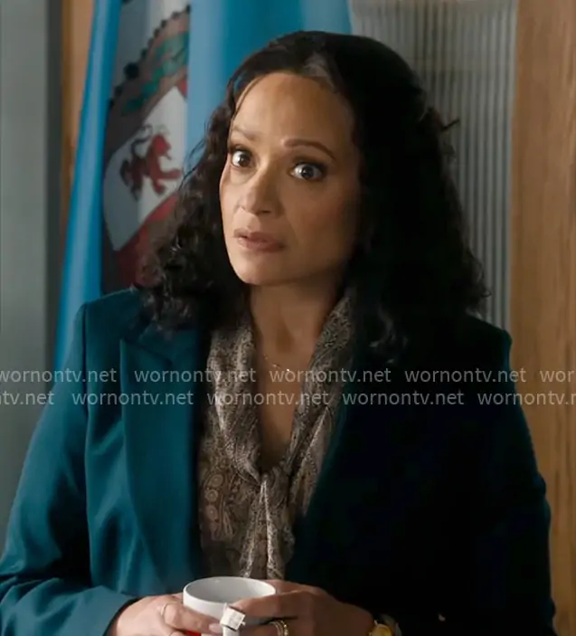 Selena (played by Judy Reyes) on High Potential on Hulu was spotted wearing this paisley print tie-neck blouse on High Potential on episode 'Family Tree' (2x18) in Apr 2026. Selena's Top is the The Paisley Tie Neck Silk Shirt by Frame.