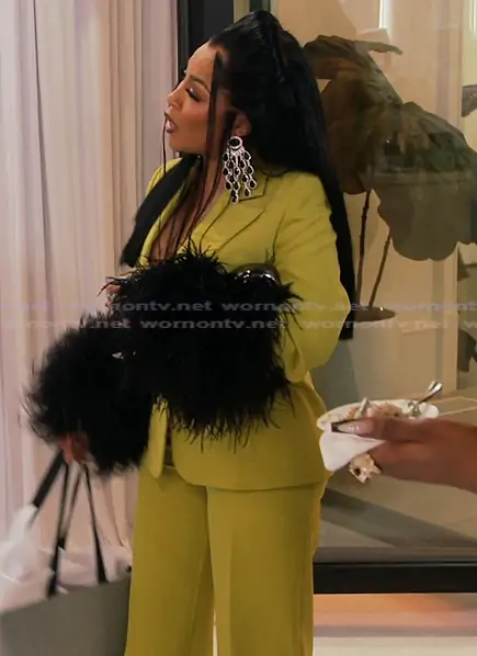 Kimberly Michelle Pate on The Real Housewives of Atlanta on Bravo was spotted wearing this yellow feather cuff blazer on The Real Housewives of Atlanta on episode 'A Warm Welcome' (17x01) in Apr 2026. K's Blazer is the Omega Blazer by Ciao by CC . K's Pants is the Omega Trousers by Ciao by CC.