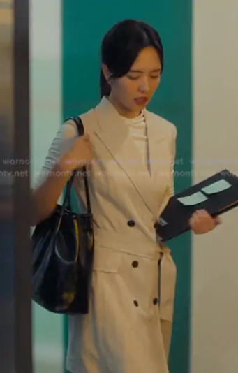 Jiwon Ahn (played by Hojo Shin) on XO Kitty on netflix was spotted wearing this beige pinstripe sleeveless blazer dress on XO Kitty on episode 'Play List' (3x03) in Apr 2026. 's Dress is the Linen-blend Blazer Dress in Light beige/Pinstriped by H&M.