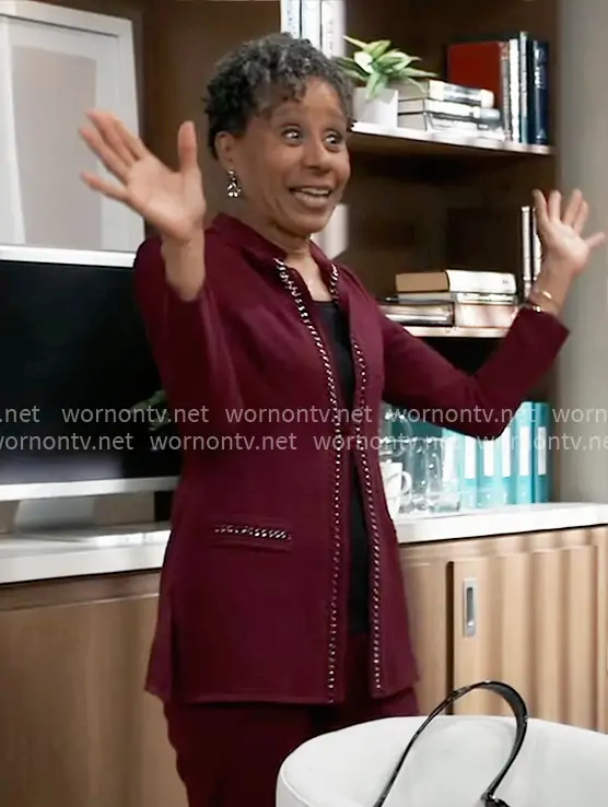 Stella Henry (played by Vernee Watson) on General Hospital on ABC was spotted wearing this purple chain-trim jacket on General Hospital on Apr 07 2026's episode. Stella's Jacket is the Chain Link Trim Knit Jacket by Misook .