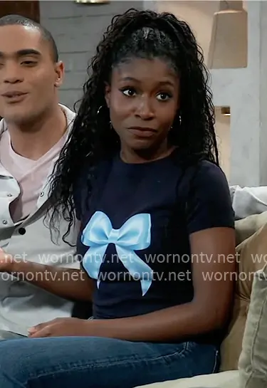 Trina Robinson (played by Tabyana Ali) on General Hospital on ABC was spotted wearing this bow graphic tee on General Hospital on Apr 07 2026's episode. Trina's Top is the Tied Up Graphic T-Shirt by Edikted .