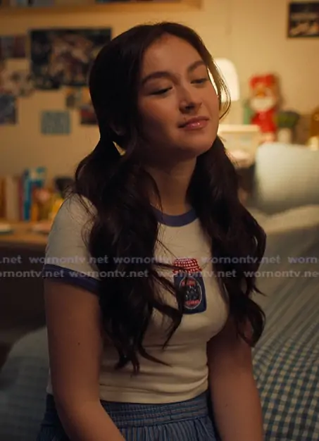 Katherine Song-Covey (played by Anna Cathcart) on XO Kitty on netflix was spotted wearing this white ringer tee on XO Kitty on episode 'A List' (3x04) in Apr 2026. Kitty's Top is the Too Perfect Blueberry Jam Graphic Ringer Baby Tee by Kimchi Blue.