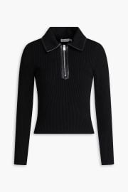 on Today on NBC was spotted wearing this black ribbed leather trim zip sweater on Today on Apr 07 2026's episode. 's Sweater is the Livana ribbed EcoVero Blend Polo Sweater by Simkhai.
