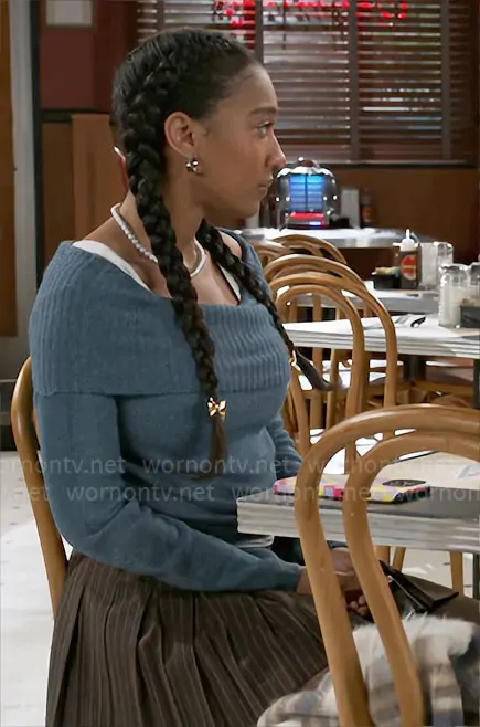 Samantha Richardson (played by Najah Jackson) on Beyond the Gates on CBS was spotted wearing this blue off-shoulder sweater and brown pleated skirt with duck bag on Beyond the Gates on Apr 07 2026's episode. Samantha's Skirt is the Pleated Pinstripe Mini Skirt by GB . Samantha's Bag is the The Fiona Beaded Bag by Anthropologie.