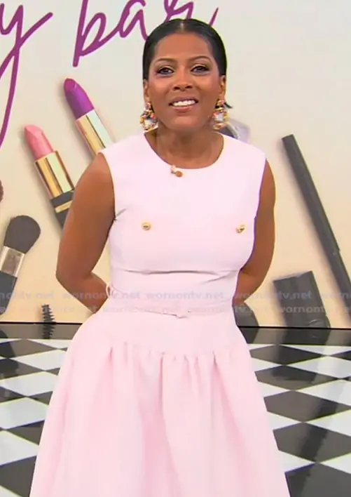 Tamron Hall on Tamron Hall Show on ABC was spotted wearing this pink belted dress on Tamron Hall Show on Apr 08 2026's episode. Tamron's Dress is the Taffeta midi dress by Self Portrait . Tamron's Earrings is the Floral Hoop Earrings by J. Crew.