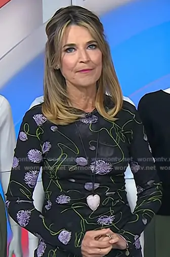 Savannah Guthrie on Today on NBC was spotted wearing this heart pendant cord necklace on Today on Apr 09 2026's episode. Savannah's Necklace is the Semi-Precious Heart Leather Cord Necklace in Clear Quartz by Jennifer Fisher.