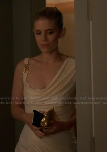 Nancy (played by Kate Mara) on Imperfect Women on Apple was spotted wearing this satin drape dress on Imperfect Women on episode 'Louise' (1x05) in Apr 2026. Nancy's Dress is the Viscose Liquid Jersey Draped Gown by Versace.