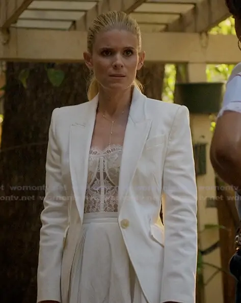 Nancy (played by Kate Mara) on Imperfect Women on Apple was spotted wearing this white blazer and corset top on Imperfect Women on episode 'Louise' (1x05) in Apr 2026. Nancy's Top is the Guipure lace bustier by McQueen . Nancy's Blazer is the Single-breasted Denim Jacket in Optical White by McQueen . Nancy's Skirt is the Pleated Midi Skirt by Alexander Mcqueen . Nancy's Shoes is the Stuart Power 100 Pumps by Stuart Weitzman.