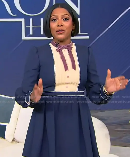 Tamron Hall on Tamron Hall Show on ABC was spotted wearing this blue tie neck mini dress on Tamron Hall Show on Apr 09 2026's episode. Tamron's Dress is the Ricrac, georgette and velvet-trimmed wool and silk-blend mini dress by Valentino Garavani.