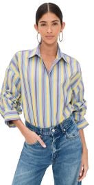 Sharon Newman (played by Sharon Case) on The Young and the Restless on CBS was spotted wearing this blue and yellow striped shirt on The Young and the Restless on Apr 09 2026's episode. Sharon's Top is the Traverse Bodysuit in Linus Stripe by Staud.