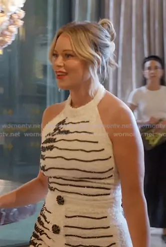 Amanda Frances on The Real Housewives of Beverly Hills on Bravo was spotted wearing this white striped boucle top and mini skirt on The Real Housewives of Beverly Hills on episode 'Drama on the Dance Floor' (15x17) in Apr 2026. Amanda's Top is the Love Letter-embroidered Tweed Top in White by Balmain . Amanda's Skirt is the Love Letter-embroidered Tweed Mini Skirt in White by Balmain.