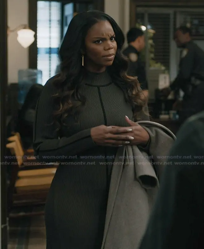 Julia Payne Wagner (played by Brittany Inge) on Elsbeth on CBS was spotted wearing this green ribbed dress on Elsbeth on episode 'Otherwise Enraged' (3x15) in Apr 2026. 's Dress is the Polly Contrast Stitch Knitted Midi Dress in Khaki Green by Reiss.
