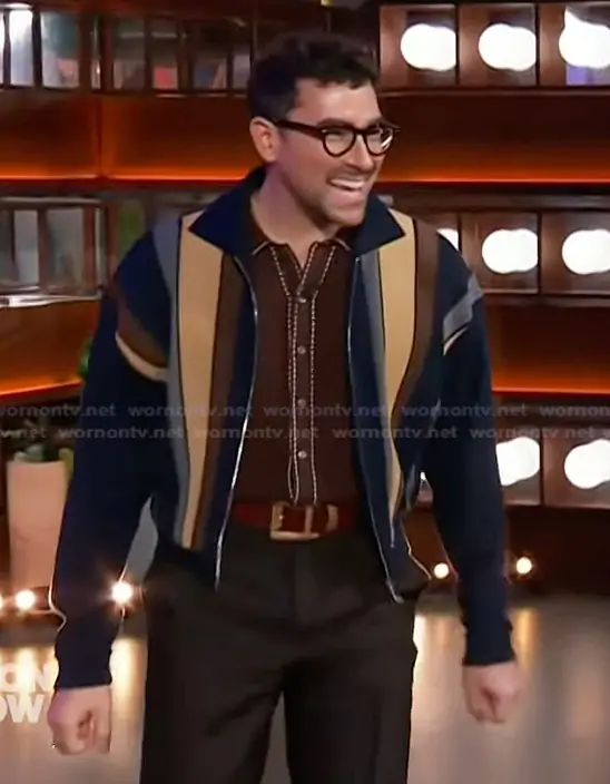 on The Kelly Clarkson Show on NBC was spotted wearing this striped sweatshirt on The Kelly Clarkson Show on Apr 10 2026's episode. 's Sweater is the Intarsia wool & leather patchwork zip sweatshirt by Versace.