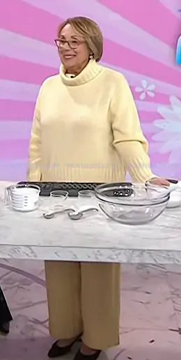 on Today on NBC was spotted wearing this yellow turtleneck sweater and satin pants on Today on Apr 10 2026's episode. 's Sweater is the Jet Cashmere Turtleneck Sweater in Pale Yellow by Jenni Kayne . 's Pants is the Summer Demi Pants in Buttercream by Jenni Kayne.