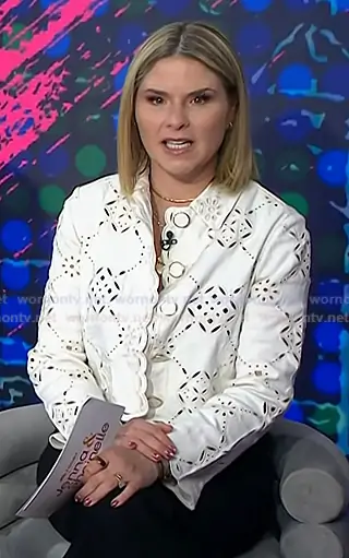 Jenna Bush Hager on Today on NBC was spotted wearing this white scalloped eyelet jacket on Today on Apr 10 2026's episode. Jenna's Jacket is the Adelaide Jacket in Ecru by Veronica Beard.