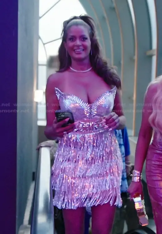 Claudia Jordan on The Real Housewives of Atlanta on Bravo was spotted wearing this silver fringe mini dress on The Real Housewives of Atlanta on episode 'Rumors and Raised Eyebrows' (17x02) in Apr 2026. 's Dress is the Ceryn Diamond Sequin Corset Dress by Art of CB.