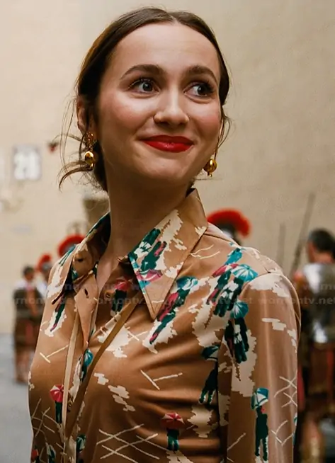 Lexi Howard (played by Maude Apatow) on Euphoria on HBO was spotted wearing this brown printed button down shirt on Euphoria on episode 'Andale' (3x01) in Apr 2026. Lexi's Top is the Vintage Nik Nik Brown button up shirt by The Era NYC . Lexi's Earrings is the Melograno Earrings in Gold by Mondo Mondo.