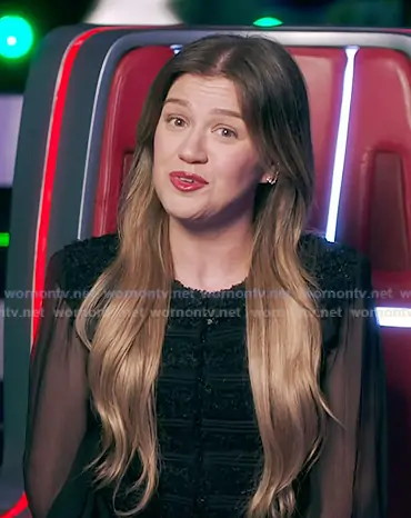 Kelly Clarkson on The Voice on NBC was spotted wearing this black sheer sleeve top on The Voice on Apr 14 2026's episode. Kelly C's Jacket is the Edge-To-Edge Tweed And Chiffon Jacket by Balmain.