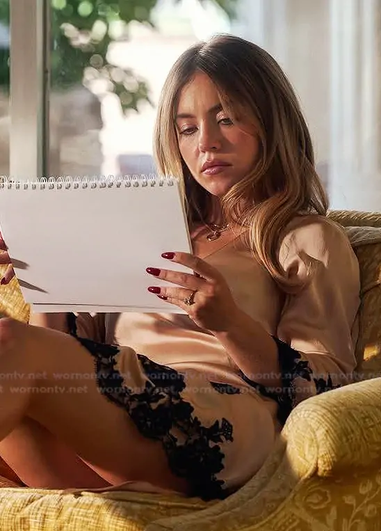 Cassie Howard (played by Sydney Sweeney) on Euphoria on HBO was spotted wearing this pink lace trim robe on Euphoria on episode 'Andale' (3x01) in Apr 2026. Cassie's Robe is the Gulia Soiree Silk Kimono Robe in Blush Pink and Black by Agent Provocateur.
