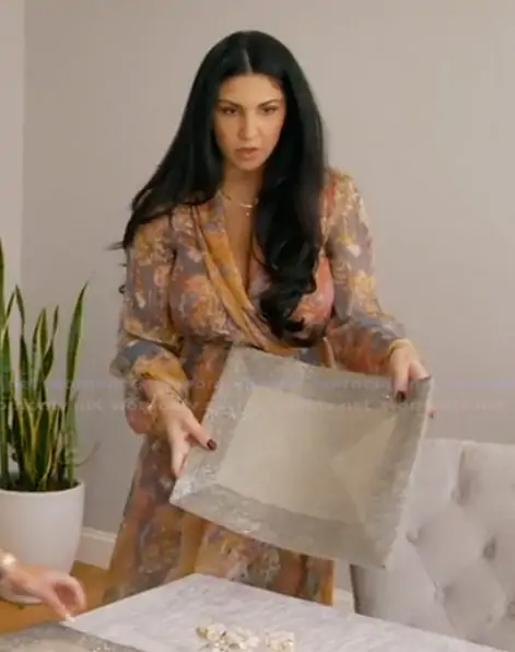 Stephanie on The Real Housewives of Rhode Island on Bravo was spotted wearing this floral wrap dress on The Real Housewives of Rhode Island on episode 'Saturday Night Fever Dream' (1x03) in Apr 2026. 's Dress is the Vivian Gown by Caroline Constas.