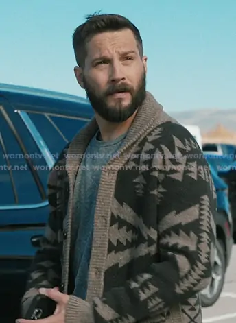 Pete Calvin (played by Logan Marshall-Green) on Marshals on Paramount was spotted wearing this beige print shawl collar cardigan on Marshals on episode 'Family Business' (1x07) in Apr 2026. Cal's Sweater is the Trapper Peak Shetland Cardigan by Pendleton.