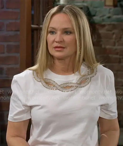 Sharon Newman (played by Sharon Case) on The Young and the Restless on CBS was spotted wearing this white beaded t-shirt with cutouts on The Young and the Restless on Apr 14 2026's episode. Sharon's Top is the Tobi Rhinestone Trim Tee by Tresse.