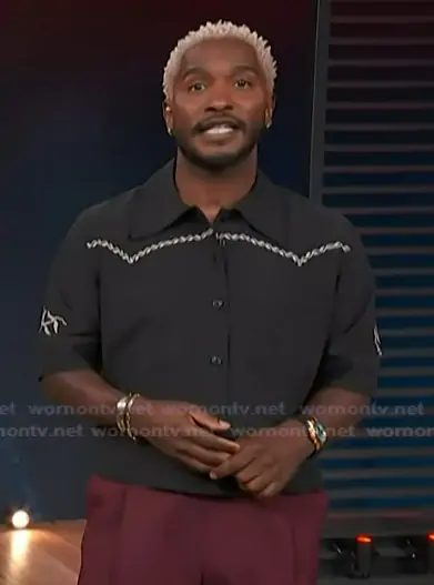 Scott Evans on Access Hollywood on NBC was spotted wearing this black embroidered shirt on Access Hollywood on Apr 15 2026's episode. Scott's Shirt is the Boxy Short Sleeve Button-Up Shirt by Scotch and Soda.