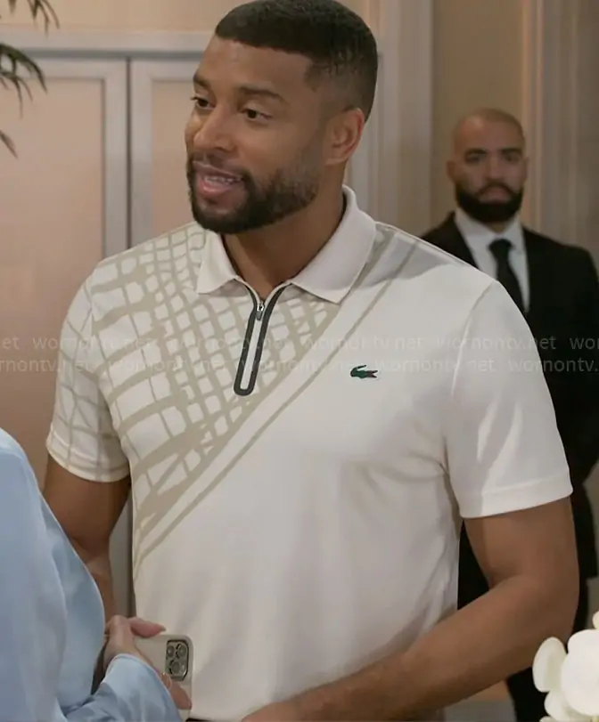 Martin Richardson (played by Brandon Claybon) on Beyond the Gates on CBS was spotted wearing this white and beige placement print polo on Beyond the Gates on Apr 17 2026's episode. Martin's Shirt is the Ultra Dry Printed Slim Fit Tennis Polo in Cream by Lacoste.