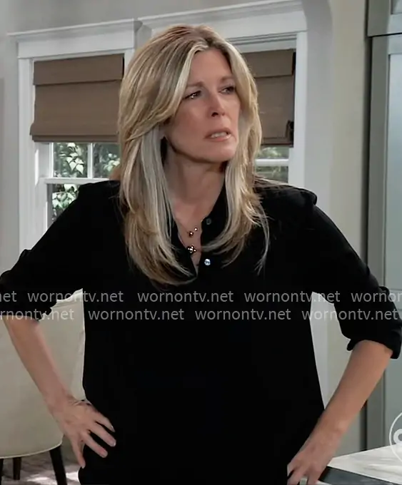 Carly Spencer (played by Laura Wright) on General Hospital on ABC was spotted wearing this black button down top on General Hospital on Apr 17 2026's episode. Carly's Top is the Slim Fit Silk Blend Button-Up Shirt in Black by Vince.