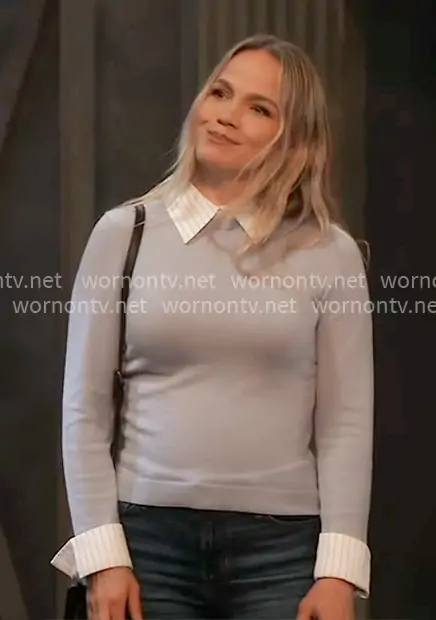 Lulu Spencer (played by Alexa Havins Bruening) on General Hospital on ABC was spotted wearing this blue layered sweater on General Hospital on Apr 17 2026's episode. Lulu's Sweater is the Porla Sweater in Carolina Blue by Alice + Olivia .