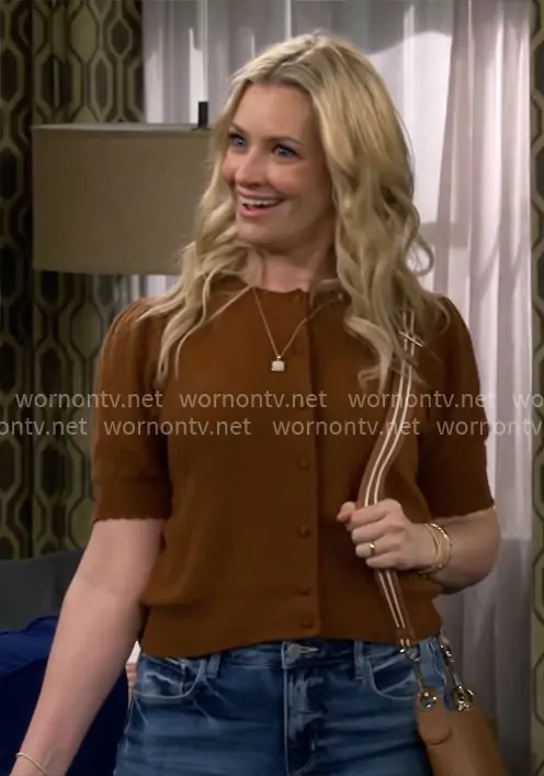 Gemma (played by Beth Behrs) on The Neighborhood on CBS was spotted wearing this brown short-sleeve cardigan on The Neighborhood on episode 'Welcome to the Purse Dog' (8x17) in Apr 2026. Gemma's Sweater is the Cashmere Pointelle-Knit Cardigan in Chestnut by Frame.