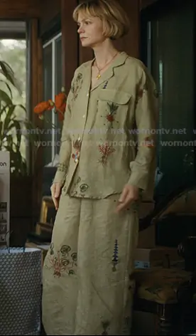Lindsay Crane-Martín (played by Carey Mulligan) on Beef on Netflix was spotted wearing this green embroidered shirt and pants on Beef on episode 'The Increasing Flimsiness of Any Certainties About the Future' (2x03) in Apr 2026. Lindsay's Set is the Lounge Set in Botanical Green by Cord.