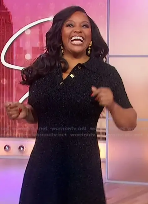 Sherri Shepherd on Sherri on FOX was spotted wearing this black metallic mini dress on Sherri on Apr 21 2026's episode. Sherri's Dress is the Sparkle Knit Short Sleeve Minidress by Ganni.