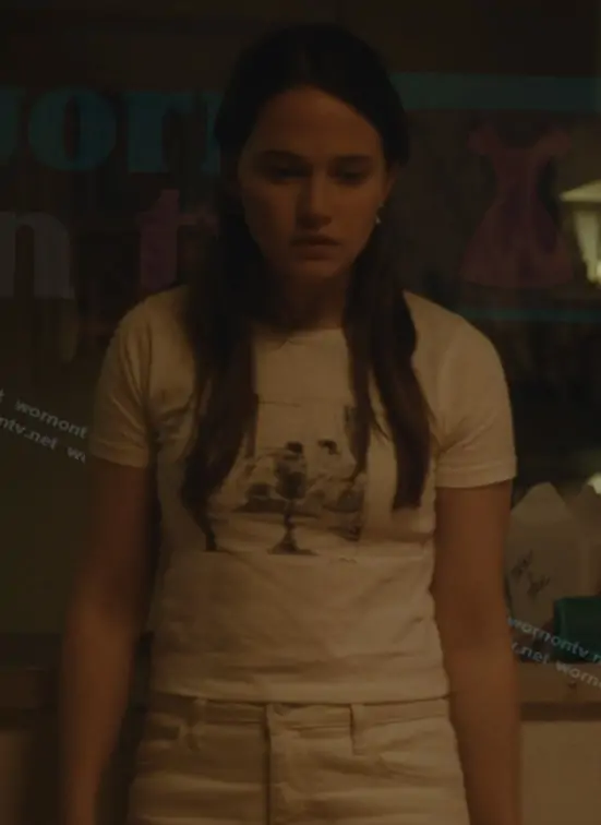Ashley Miller (played by Cailee Spaeny) on Beef on Netflix was spotted wearing this white graphic tee on Beef on episode 'Those Blue Remembered Hills' (2x06) in Apr 2026. Ashley's Top is the Ballet Dancers Sketch Cotton Graphic T-Shirt by Golden Hour.